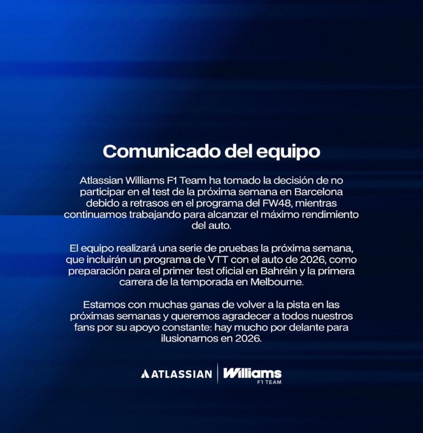 Williams anunció oficialmente que no participará en los test de pretemporada en Barcelona.